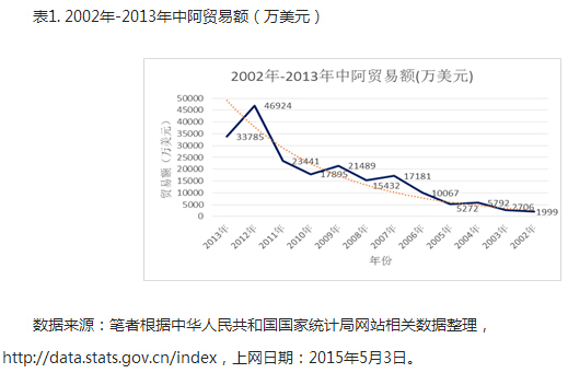 中阿两国贸易结构中,中国出口商品以工业制成品为主,有电器和电子产品、运输设备、机械设备和纺织服装等,据中国驻阿使馆经参处数据显示,自阿富汗进口的商品主要以初级产品为主,有皮毛和建材。自2002年双方恢复关系以来,两国贸易额保持平稳增长态势。十几年中,因为2008年金融危机及阿国内局势问题贸易额虽有起伏,但总体呈上升趋势,前景比较乐观(见表1)。