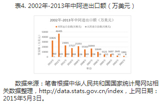 即便如此,中阿之间贸易总体上还处于很低的水平,根据中国国家统计局相关数据排名显示,2013年中阿贸易额在中国与有统计数据的51个亚洲国家和地区排名中,仅排名第46位,排名非常靠后,仅略高于马尔代夫、巴勒斯坦、东帝汶和不丹等国,占中国与亚洲贸易总额比例非常低,2013年仅占中国与亚洲贸易的0.015%(见表2),并且多年来一直没有明显增加,增长趋势十分缓慢,一直徘徊在0.015%上下(见表3),此外中阿进出口贸易非常不平衡,中国对阿出口商品一直以来都占了双方贸易额的绝大份额(见表4),在与阿富汗共同建设一路一带的过程中必须引起足够的重视。
