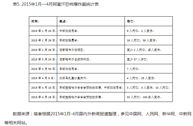 阿富汗恐怖主义历来十分严重,塔利班掌权时代成为基地组织大本营。2001年之后塔利班政权虽然倒台,但是恐怖主义至今依旧十分严重,每年都发生多起恐怖袭击,绑架有之、袭击平民有之、炸毁工程项目或绑架工人亦有之,对阿富安政治稳定造成严重危害,更严重的是在民众中造成了长久的心理恐慌。驻阿富汗国际安全援助部队2014年12月28日结束在阿战斗任务,自15年1月1日起,阿富汗军警全面接管国内防务。笔者查阅2015年1月-4月国内外新闻报道显示,2015年之后,每个月都会发生至少一起严重的恐怖袭击,刚刚过去的4月份甚至发生3起,2015年4月18日的袭击中伤亡达百人以上(表5),阿富汗恐怖组织活动依旧频繁,从目前形势看来未来恐怖袭击仍会有增无减,从袭击地点看呈全国蔓延的趋势,阿国内舆论对安全状况普遍表示忧虑。恐怖袭击频发,一方面说明恐怖组织活动频繁,另一方面也表明阿中央政府及所属部队控制能力低下,在更深的层次反映的是阿政府履约能力差,即是与阿政府达成官方协议,也很可能有始无终。此外,ISIS(伊斯兰国)在中东蔓延,2015年初已经在阿富汗出现其势力,中国新疆是一路一带的核心区,是丝绸之路的战略重心,本身存在一定程度的恐怖主义和分离势力,中国新疆与阿富汗毗邻,要防止ISIS势力渗透至新疆,杜绝国际恐怖主义势力蔓延至中国境内。