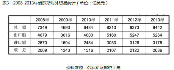 根据中国驻俄罗斯联邦经济商务参赞处的相关数据,中国长期居俄罗斯第一大贸易伙伴,俄罗斯是中国第九大贸易伙伴。中国海关数据显示,2014年中俄双边贸易额达788.9亿美元,同比增长7.1%。中国对俄出口额为442.5亿美元;中国从俄进口额为346.3亿美元。近年来,中国对俄罗斯出口商品主要有机械设备、服装及衣着附件、电器和电子产品等;来自俄罗斯的进口产品主要集中在原油及成品油、铁矿砂、原木等。