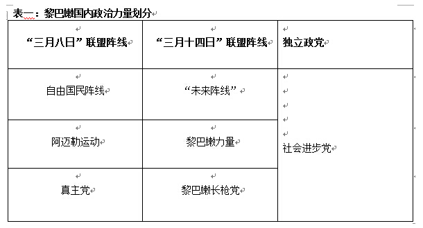 尽管黎巴嫩国内政党林立,但是根据政党之间的相互关系,大体上可以将黎巴嫩的政党力量划分为两个相互对立的政治同盟。