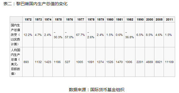 通过上表我们不难看出,在上世纪70年代和80年代,黎巴嫩经济曾经发生过两次重大的衰退。而这两次经济衰退都是由于爆发在国内各个政治和军事派别之间的战乱冲突导致。时至今日,在黎巴嫩国内的不少地点,仍然可以见到当年内战时期被战火毁坏的各类军事和民用设施遗迹。