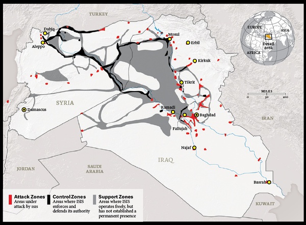 在支持者看来,对疆土的控制是伊斯兰国权威性的前提条件。这幅地图采自战争研究学院,显示的是截止1月15日哈里发国控制的疆域,还有它正在进攻的地域。在它统治的地区,伊斯兰国征收捐税、控制价格、设立法庭,并提供从医疗保健到教育通讯的各种服务。