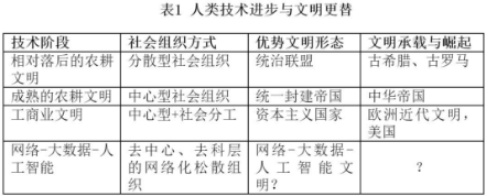 从人类技术演化与文明的进化来看,每一种新的重大的技术阶段,都对应着一种相应的历史阶段,同样也对应着一种某一具体的国家或者民族以及与之对应的文明体系的崛起[③]。在不同历史阶段之间,存在着明显的技术与社会形态的转化,人类正是在这样的转化中,形成此起彼伏的文明兴衰并整体推动人类历史的进步。