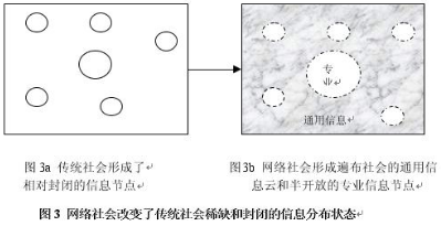 当然,网络时代的信息分布,也并不是自然而然就会彻底改变原有的信息稀缺和不均匀地位。因为,信息分为两种,一种是相对通用的信息,另一种是高度专业化和保密化的信息。在传统社会中,无论是相对通用的信息还是专业保密化的信息都是仅仅围绕在信息生产者的附近形成致密的信息节点,信息拥有者还会通过各种手段还制造信息壁垒,如早期制造业的行会、工商业革命后期的商业秘密等。但是在网络文明时代,在三个方面改变了这种状态:首先,互联网极大改变了通用信息的分布,通用信息成为公开的任何人可以获取的信息;其次,原先相对专业的信息,也由于信息的分享,而逐步变成相对通用的信息;第三,对于最核心的专业信息,即便互联网没有实现彻底的便利获取,但是专业信息与通用信息是存在依附关系的,当围绕某一专业知识的其他周边通用知识都被容易的获取时,那么,与之相关的高度专业的信息,也就逐渐成为半透明和通过各种技术获知。