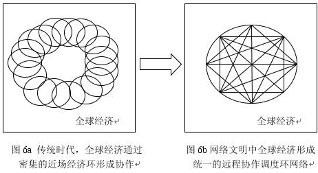 互联网的出现,在经济领域则深刻改变了这种形态。网络经济与传统经济模式的最大区别,就是改变了传统经济近场经济圈的模式,形成了远距离的资源全程调度与配置和经济协作。互联网起初是用于个人通讯,随后很快应用在经济领域,最初只是简单的经济信息的传递,随后发展为电子商务系统,进一步则渗透到生产领域,形成工业互联网,未来的发展,则是整个经济活动与互联网的高度融合,形成高度发达的智能物联网。在高度发达的网络文明时代,则形成了跨域地域覆盖全球的网络经济圈。生产者和消费者之间的地域差异被逐渐缩短,生产者和生产者之间的协作距离也被进一步加大,形成了互相渗透互相转移的覆盖模式。甚至生产者与消费者之间的角色也是相互模糊的,消费者向需求网络传达需求信息,由高度发达的智能物联网自动选择最优的生产设备,并通过自动配送或者直接传递给居家的小型快速制造设备(如3D打印)进行直接生产。在这种模式下,人类的经济模式的形态会被彻底的改变。