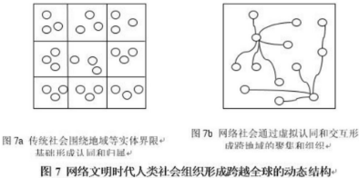 网络文明在形成跨越物理与虚拟的存在后,则必然形成了跨越全球地理域的社会组织形态。在这种形态下,除了生产交易外,人类的其他社会交易乃至人的存在归属本身,也是覆盖全球的。这体现在三个层面:首先,网络虚拟的逻辑空间是分布在全球物理空间的,对于同一个网络页面或者服务,看起来似乎是同样的,但是实际上其服务器的物理存在可能是分布全球的数据云的,因此,这就在网络存在的基础上消除了地域约束;其次,人的生活本身是全球分布的,在网络文明,人类获取经济与公共服务资,不仅依托的是本地的局域公共商业和公共服务机构,而是直接在互联网上获取,通过全球网络来配置资源和形成交互,这就形成了社会组织管理更多是依赖网络聚集而不是现实聚集来实施;第三,人的心理归属是全球分布的,传统时代人的心理归属总是围绕着血缘、地域、民族、国家等物理生理依托,本质上还是围绕实体的依托与认同。而网络文明中,全球的人们在实体归属的基础上,也将围绕着若干网络虚拟平台或者身份进行聚集和认同,他们在现实中是某个民族的人,但是在网络上可能因为某种身份而更为认同和聚集。因为这种结构并不严格依赖现实生理物理基础,因此这种认同和组织结构也更为动态,一个人可以较为容易的改变自身的集群归属和属性认同。