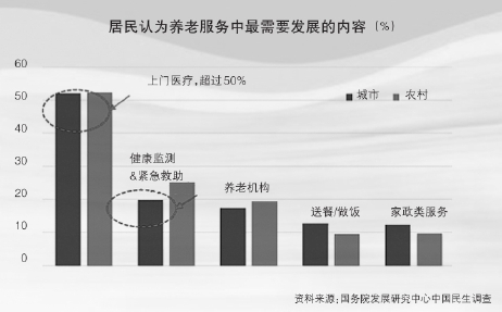 绝大多数中国老年人仍在家庭和社区养老,入住机构的比例很低且呈下降趋势,从2012年的1.26%下降到2016年的0.79%。在这一背景下,老年人更多需要依托社区的居家养老服务。国务院发展研究中心开展的中国民生调查显示,上门医疗服务是不同特征老年人共有的占比最高的需求,达到52.2%,紧随其后的是健康监测和紧急救助,送餐/做饭、打扫卫生等家政服务也有较大需求,随着高龄、空巢老人的进一步增加,有关服务需求还会快速攀升(见图)。